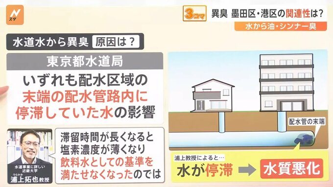 浦上教授は末端に停滞していた水の水質悪化を指摘し、「滞留時間が長くなると、塩素濃度が薄くなり、飲料水としての基準を満たせなくなったのでは」としています。