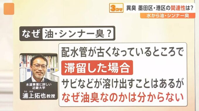 浦上教授は「配水管が古くなっているところで滞留した場合、サビなどが溶け出すことはあるが、なぜ油臭なのかは分からない」といいます。