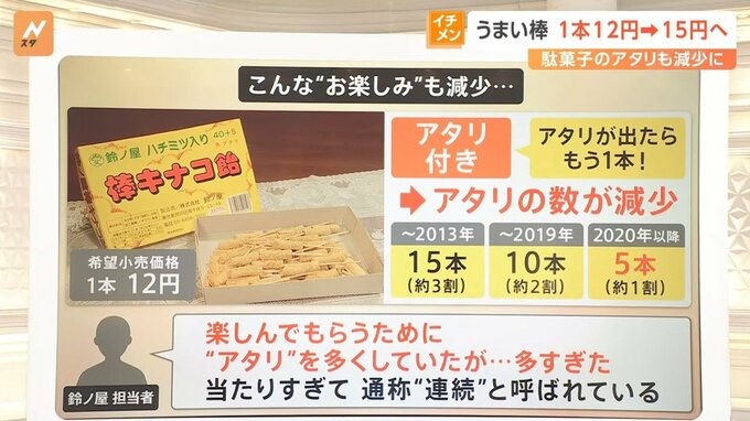 さらに、きなこ棒(希望小売価格1本12円)のアタリの数も減ってきているそうです。1箱に対してアタリは2013年までは15本(約3割)、2019年までは10本(約2割)、2020年以降は5本(約1割)に減ってきているということです。