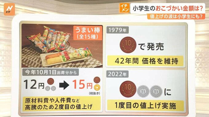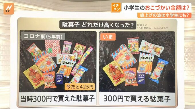 駄菓子の値上げは「うまい棒」だけではありません。駄菓子店「石川商店」の石川活叶さんによりますと、コロナ前(5年前)、300円で買えた駄菓子12点は今だと425円。現在300円で買うことができる駄菓子は8点ほどになってしまったそうです。