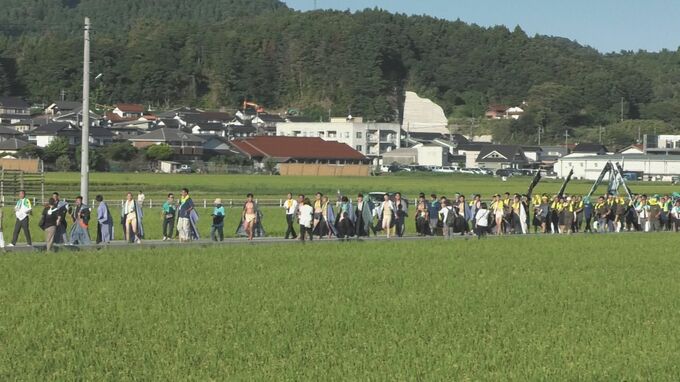 9月14日、島根県隠岐の島。相撲甚句が響くなか、集落を練り歩く男たち。