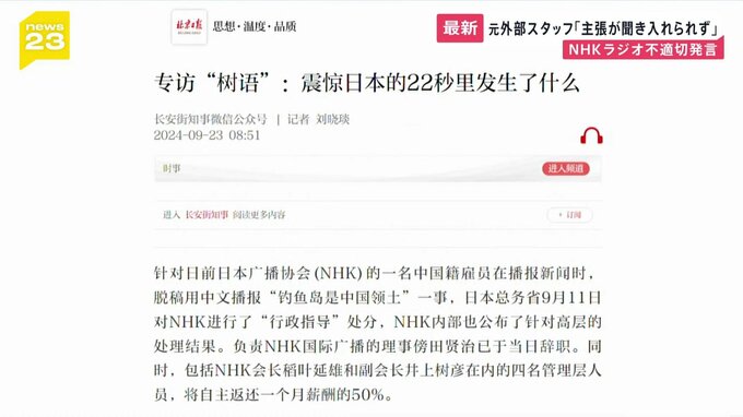 NHKのラジオ国際放送で、尖閣諸島は「中国の領土」などと発言した中国人の元外部スタッフが中国メディアのインタビューに応じ、“自分の主張が聞き入れられなかったためだ”などと主張しました。中国メディア「北…