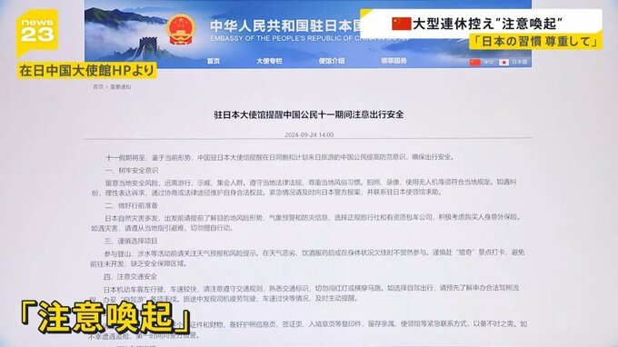中国の建国記念日にあたる「国慶節」に伴う大型連休。例年、多くの中国人が日本を訪れますが、中国大使館がこんな注意喚起をしました。