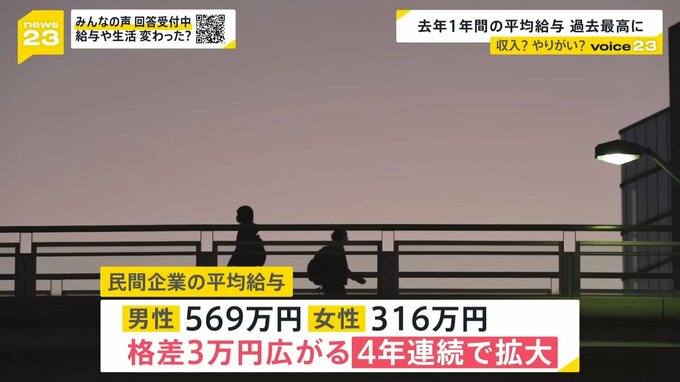 男女別では男性が569万円、女性が316万円。格差は2022年より3万円広がり、4年連続で拡大しました。