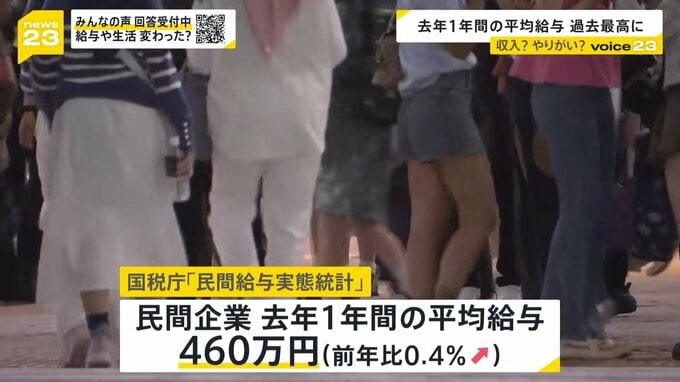 国税庁が2024年9月25日に公表した「民間給与実態統計」によりますと、民間企業で働く人の2023年1年間の平均給与は、2022年より0.4%増加して460万円でした。増加は3年連続で、比較できる2014年以降、過去最高です。