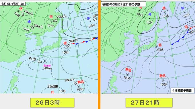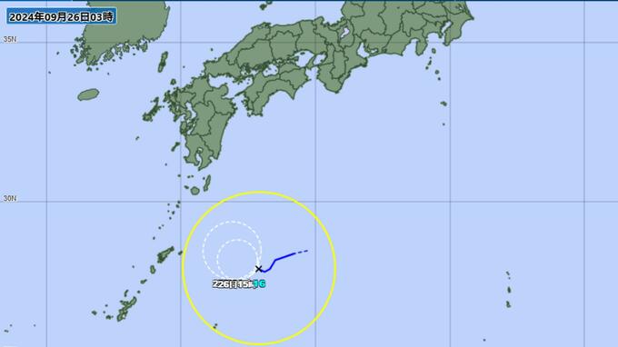 日本の南海上にある台風16号(シマロン)は、26日午前3時現在、ゆっくりと西へ進んでいます。中心気圧は1002ヘクトパスカル、中心付近の最大風速は18メートル。今後進路を北寄り、さらに東寄りへと変える見込みです。27日には熱帯低気圧に戻る予想となっています。(26日午前)