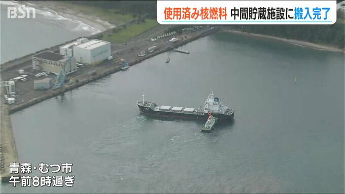 むつ市の港に入った使用済み核燃料の運搬船。