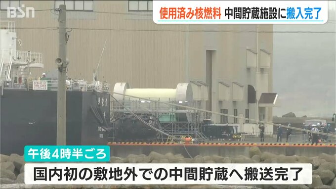 運ばれたのは柏崎刈羽原発4号機の使用済み核燃料69体で、午後4時半、国内で初めてとなる原発敷地外での中間貯蔵へ向けた搬送が完了しました。