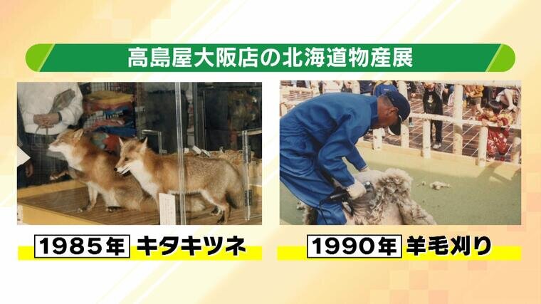 その2年後の1951年、高島屋大阪店が全国初の北海道物産展を開催します。しかし当時は今のようなスイーツもない時代。そこで集客のために行われたのが「牛の乳しぼり体験」。当時の関西の人にとっては「北海道ってどこ?」というほど遠い存在だったため、インパクトを与えるために行われたということです。その後も高島屋大阪店では、1985年にキタキツネ、1990年には羊毛刈りなどの目玉イベントで北海道物産展を広めていきました。当時は鮭をくわえた熊の木彫りや毛皮などを売っていたそうです。