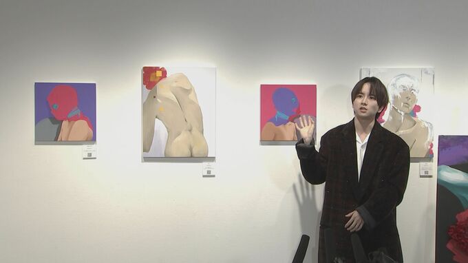 これまで趣味でデジタルアートなどを楽しんできた板垣さんですが、映画「ブルーピリオド」の出演を機に、自身のアート欲が高まる中で制作に取り組み、これまで描いてきたデジタルイラストに油絵を重ねる複合アートを12点制作。今回は「渇愛(かつあい)」をテーマに作品を展開しています。