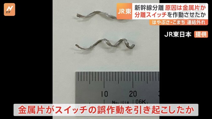 東北新幹線の連結部分が走行中に外れた問題で、JR東日本は連結を分離させるスイッチの裏側から金属片が見つかり、これが原因となったとみられると発表しました。今月19日、東北新幹線が時速およそ315キロで走行し…