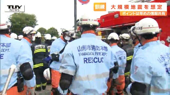山形市消防本部では、年に2回、霞城セントラルと合同で訓練を行っていて、今回は事前に詳しい被害状況などが知らされないいわゆる「ブラインド型」と呼ばれる方法で実施されました。