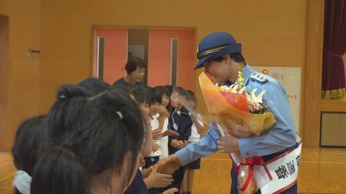 舟久保署長は母校の児童に交通安全と防犯を呼びかけました。