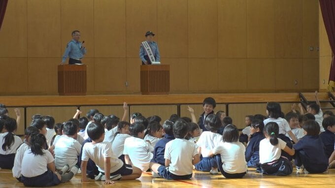 また母校の富士吉田市の明見小学校を訪れ、約370人の全校児童に交通安全と防犯教室を行いました。