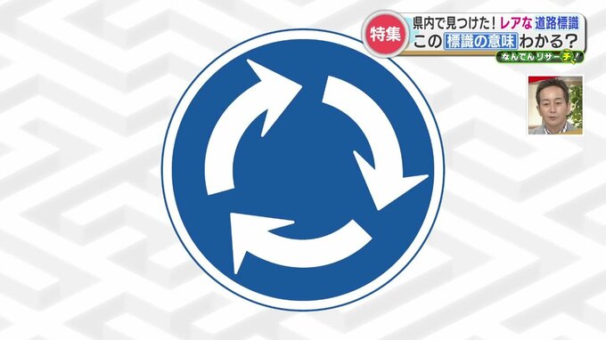 最初のレア道路標識は…なにやら矢印3つで丸が描かれています。リサイクルマークにも似ています。実は、熊本県内に5枚しかない標識です。※2024年9月時点