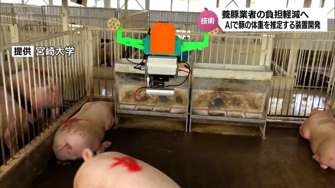 AIを活用し畜産農家の負担軽減を図る技術についてです。宮崎大学と日本ハムの共同研究グループが、自動で豚の体重を推定できる装置を開発しました。無人の豚舎で豚の上をゆっくり動く装置。これは、宮崎大学工学部…