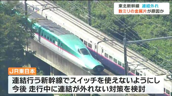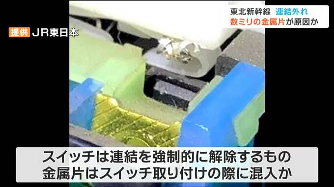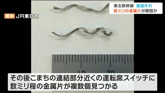 JR東日本によりますと、直後の連結部分の検査では異常はみられなかったものの、その後、こまち号の連結部分近くの運転席にあるスイッチに数ミリ程の金属片が複数個見つかったということです。このスイッチは、列車の連結を強制的に解除するもので、金属片は、スイッチを取り付ける際に混入したとみられています。