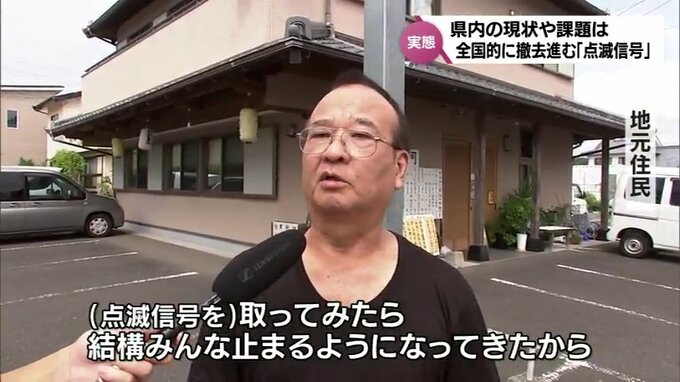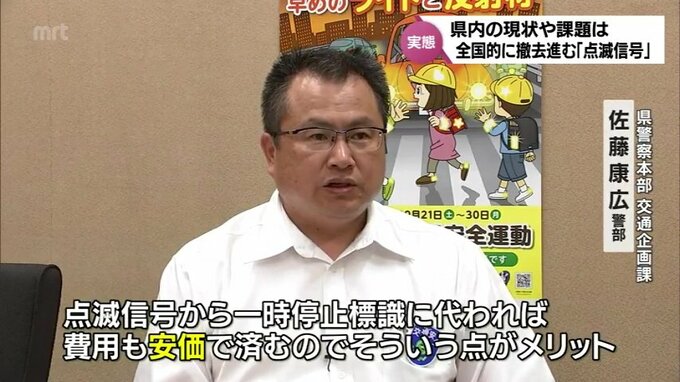 「確実に止まって、ほかの車両を交差道路の車両や歩行者に注意して進行すれば、事故が減ってくることができるので、それと、非常に点滅信号から一時停止標識に代われば費用も安価で済むので、そういう点がメリット」