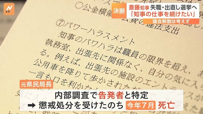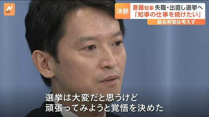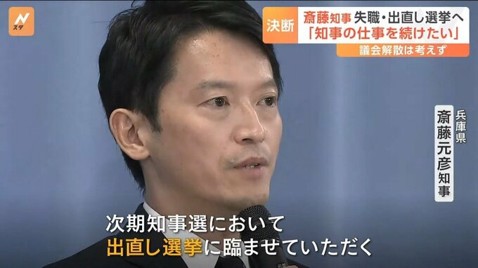 「知事の仕事をまだまだ続けたい」。パワハラ疑惑などを告発された兵庫県の斎藤知事が、30日付で失職し、出直し選挙に臨むと発表しました。
