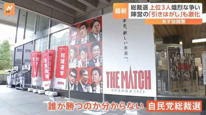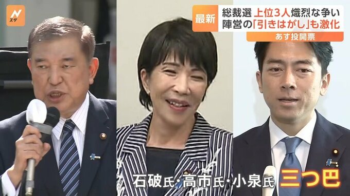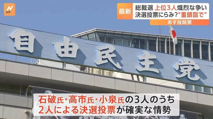 27日に投開票を迎える自民党総裁選挙について、JNNが最終盤の情勢を探ったところ、石破氏・高市氏・小泉氏の3人が激しく争い、このうちの2人が決選投票に進むのが確実なことがわかりました。(9月26日「Nスタ」午後4時50分ごろの放送より)