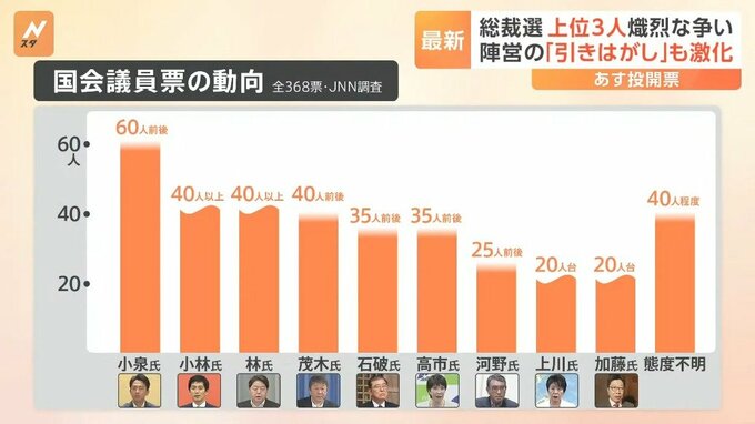 全体の半数を占める議員票について、JNNの取材では小泉氏が60人前後の支持を固め、トップに立っています。これに小林氏と林氏が40人を超える議員票を固めて追う展開です。