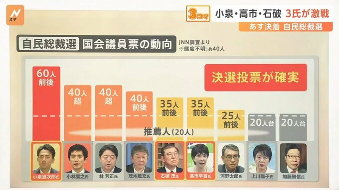 JNNの調査による国会議員票の動向(※態度不明:約40人)では、トップを走るのが小泉氏で、60人前後の支持を集めているとみられます。