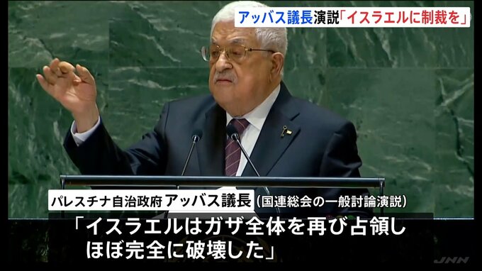 パレスチナ自治政府のアッバス議長が国連総会で演説し、イスラエルに対して制裁を科すよう国際社会に呼びかけました。国連総会に出席するためアメリカ・ニューヨークを訪れているパレスチナ自治政府のアッバス議長…