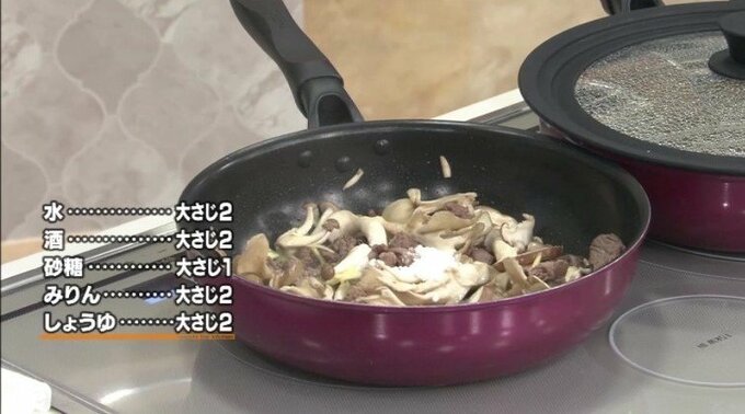 2.鍋にサラダ油を熱して牛肉を軽く炒め、きのこを入れる。