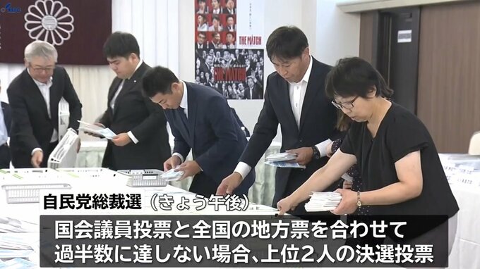 今回の総裁選には9人が立候補していて、午後から行われる国会議員による投票と全国の地方票を合わせて過半数に達しなければ、上位2人による決選投票となります。