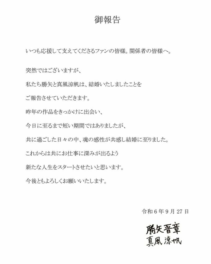 公式サイトで真風さんと、勝矢さんは2人の署名入りのコメントを投稿。「突然ではございますが、私たち 勝矢と真風涼帆は、結婚いたしましたことを ご報告させていただきます」と知らせました。