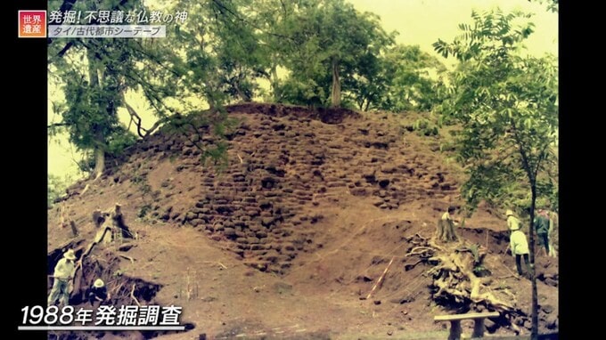 この古代都市をつくったのはモン族という、タイ族よりも古くから住んでいた民族。タイの中心部を流れるチャオプラヤー川流域に、シーテープ以外にもいくつも都市を築き、ドヴァーラヴァティーという王国をつくりました。6世紀頃から繁栄した王国の実態は都市の連合体だったと考えられているのですが、分かっていないことも多いナゾの国です。古代都市シーテープにしても1970年代になってようやく発掘・調査が始まった遺跡で、それまでは森の中に埋まっていたのです。遺跡の多くは土で覆われて丘のようになっており、丘の上には木まで生えていました。