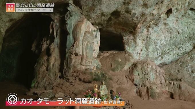 モン族とはどんな人々だったのか…その手がかりがシーテープの西20キロの山の中にありました。カオ・タモーラットという高さ600メートル弱の山なのですが、その山頂付近の洞窟がかつてモン族の僧院だったのです。番組でも撮影したのですが、行くのが大変で険しい山道を登ること約2時間。1400年前に作られたという洞窟僧院は内部がかなり広く、仏陀の姿や仏塔が岩に彫られて残っていました。モン族は仏教と聖なる山を信仰していたので、こんな山の上に仏教の僧院があったのです。他にもいろいろとモン族と古代都市シーテープのナゾに迫ったので、放送をご期待ください。