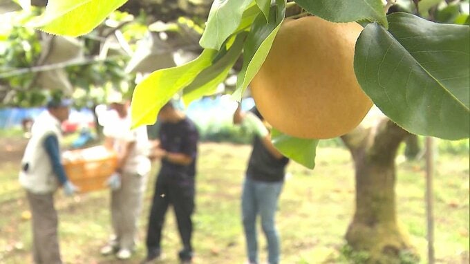 大分県由布市の障害者就労支援施設のナシ園で、旬を迎えた「新高」の収穫作業が進められています。