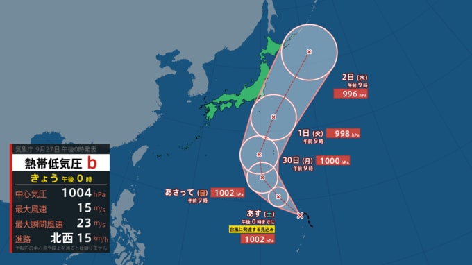 「台風17号」は、北緯27度40分、東経139度55分を中心に『日本の南』で北方向に時速15kmの速さで進むとみられます。中心の気圧は998ヘクトパスカルで中心付近の最大風速は20メートル、最大瞬間風速は30メートルとなっています。予報円の半径は300kmとなっています。
