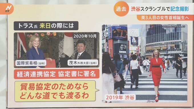 トラス氏は、過去に国際貿易大臣として日本に来日しています。2020年、「経済連携協定」の協定書に署名をしました。2019年には、この準備のために来日しています。そのとき撮った、渋谷のスクランブル交差点を赤いかっこいいワンピースで歩いている姿の写真をInstagramにアップしています。この写真には「貿易協定のためなら、どんな道でも渡るわ」と、スクランブル交差点を渡っている姿とリンクさせたようなコメントが添えられていました。