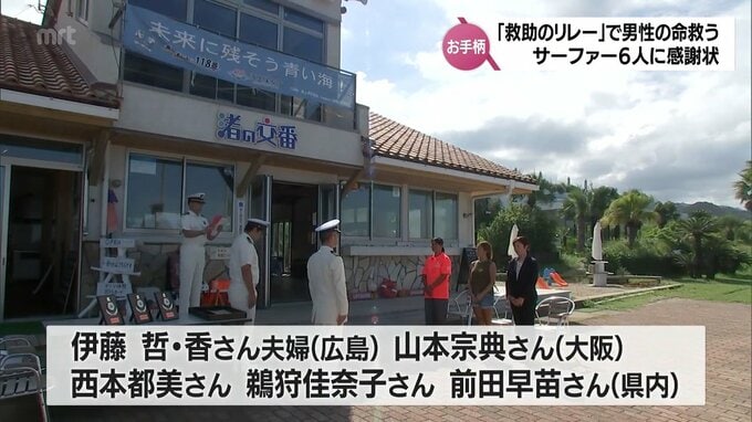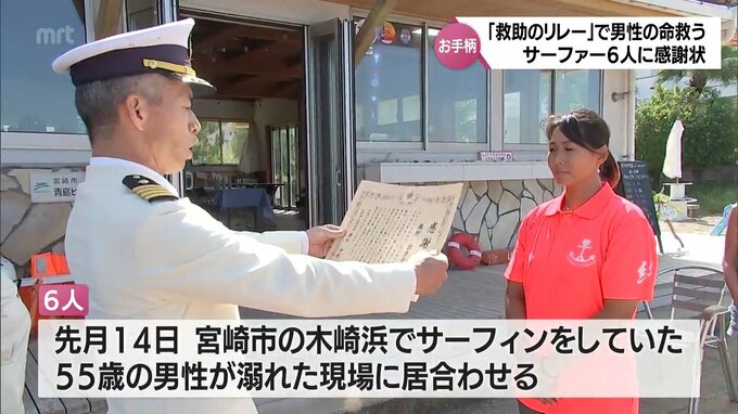 サーフィン中に溺れた男性を協力して救助したとして、宮崎県内外に住む男女6人に宮崎海上保安部から感謝状が贈られました。