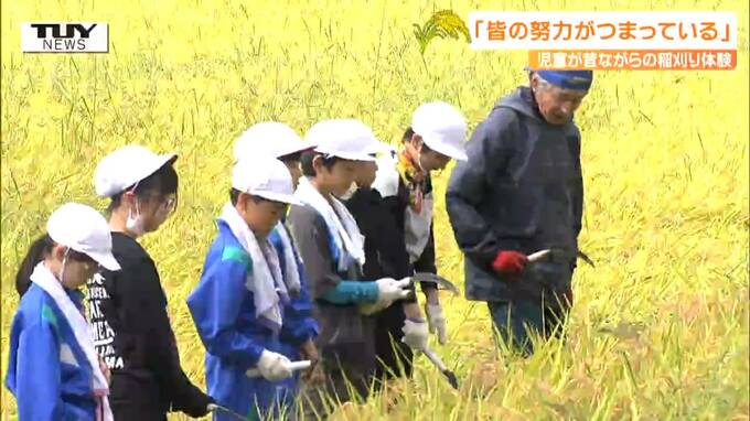 きょうは、今年の春に小学5年生の児童およそ20人が田んぼの先生の農家、渡邉厚(わたなべ・あつし)さんに教わりながら手で植えた山形95号の稲刈りの日です。