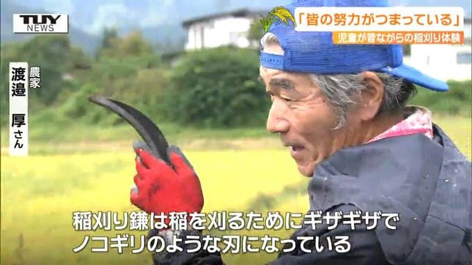 農家 渡邉厚さん「稲刈り鎌は、稲を刈るために特殊にギザギザで、ノコギリのような刃になっています」