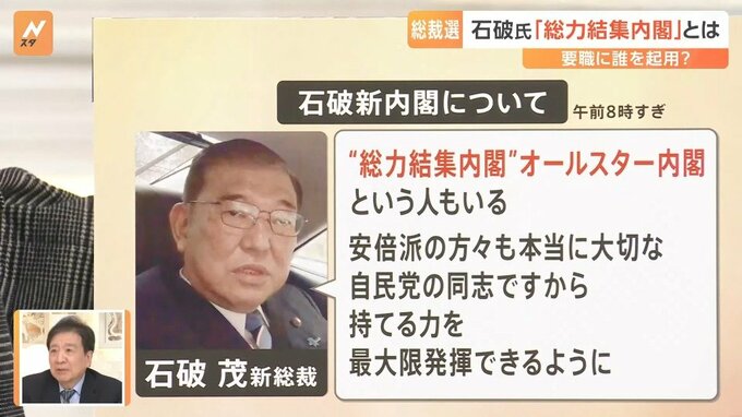 そして、このあとは組閣ということになります。27日朝の取材に石破氏は「“総力結集内閣”、オールスター内閣という人もいる。安倍派の方々も本当に大切な自民党の同志ですから、持てる力を最大限発揮できるように」と答えていました。安倍派も、完全に除外するというわけではなさそうです。