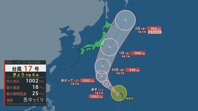 【台風情報】沖縄の南の熱帯低気圧は“台風18号”に 週明けの沖縄は雨風ともに激しく 台風17号は関東や東北に接近へ 最新の進路予想と雨と風シミュレーション 北陸放送 2024年9月27日(金) 20:37 国内 そして、台風17号は27日午後6時現在マリアナ諸島にあって、西にゆっくり進んでいます。中心気圧は1002ヘクトパスカル、中心付近の最大風速は18メートルです。 週明け10月1日(火)には、関東沿岸に近づく予想になっています。