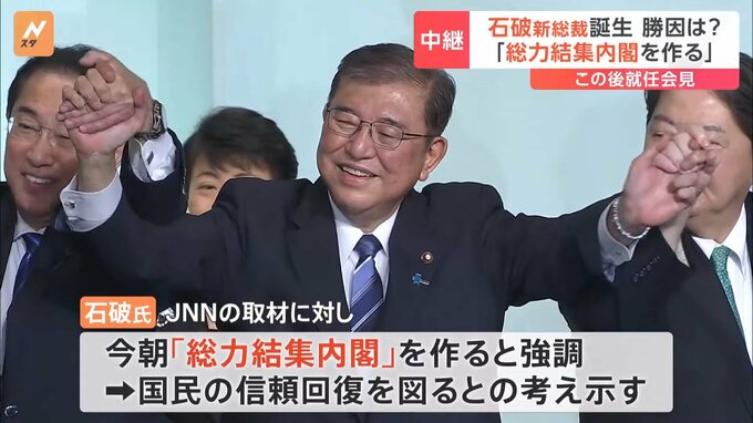 10月1日に召集される臨時国会で、総理大臣に選出される石破氏ですが、自民党が裏金問題で揺れる中、石破氏は今朝、JNNの取材に「総力結集内閣」を作ると強調し、国民の信頼回復を図るとの考えを示しています。