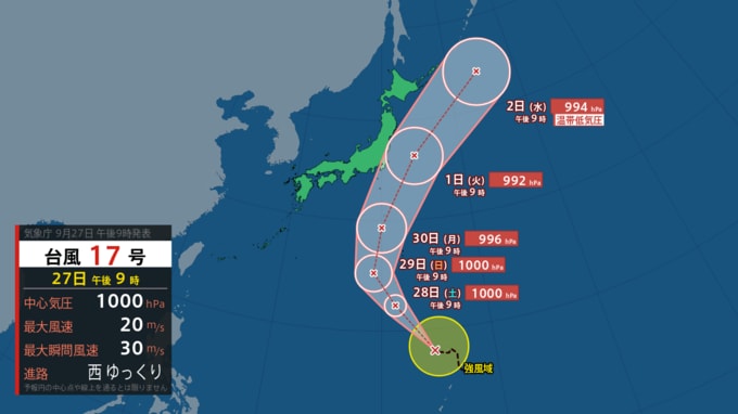 「台風17号」は、北緯25度05分、東経139度10分を中心に『日本の南』で北北西方向に時速15kmの速さで進むとみられます。中心の気圧は1000ヘクトパスカルで中心付近の最大風速は20メートル、最大瞬間風速は30メートルとなっています。予報円の半径は185kmとなっています。