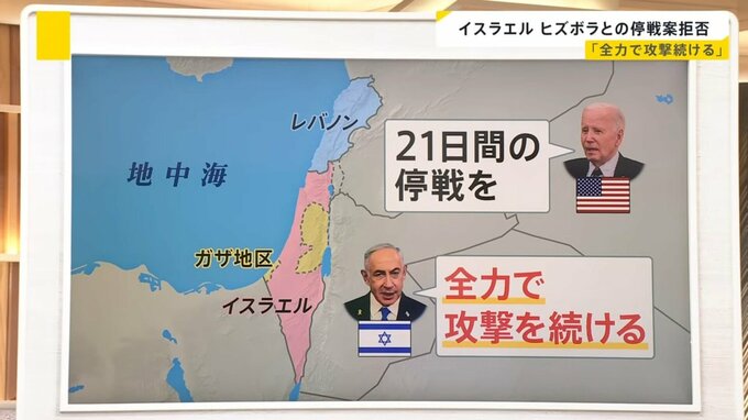 イスラエルは現在、南部ではガザ、北部ではレバノンと衝突している状態です。そのイスラエルに対し、日本・アメリカ・フランスなどはレバノンの国境地帯での21日間の停戦を呼びかけていますが、イスラエルのネタニヤフ首相は「全力で攻撃を続ける」としています。