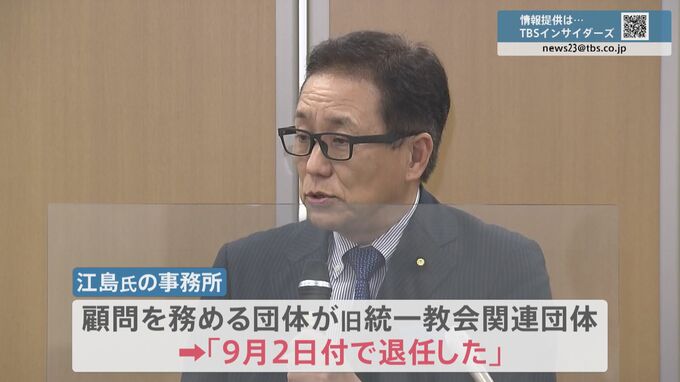 江島氏側に6日、改めて確認したところ「顧問を務める団体が教団関連だと判明したため、9月2日付で退任した」との回答がありました。