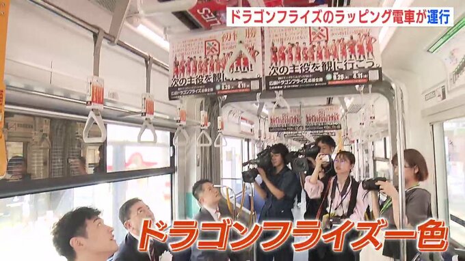 広島ドラゴンフライズのラッピング電車は、今回で9代目になります。車体には選手の等身大の写真がデザインされ、電車内もドラゴンフライズ一色です。選手による車内アナウンスも流されます。