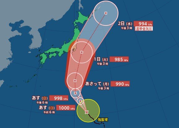 中心の気圧は965ヘクトパスカル、中心付近の最大風速は40メートル、最大瞬間風速は55メートルが予想されます。