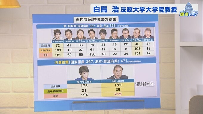 「派閥なき総裁選」から始まって「派閥復活の総裁選」で終わったと言ってもいいと思うんですね。決選投票を見ると明らかに派閥単位で行動している。そうでなければこれだけ大きな票の動きは無いはずなんです。「派閥なき総裁選」で確かに9人が出て、色々な論戦が行われて、若い方も出た。それは非常によかったと思うんです。ところが最終的には派閥単位で投票して派閥復活というのを少し印象づけてしまったというところがあるんじゃないかと。ただ、結果として石破さんが総裁になれているっていうのは、今回のこの総裁選の特徴の一つを如実に表している。石破さんはやっぱり派閥政治の中だと勝てないんですよ。「派閥なき」というところで決選投票まで残った。そこで勝機があった。派閥が解散してなければおそらく「石破総裁」はなかっただろうと考えられるわけですね。