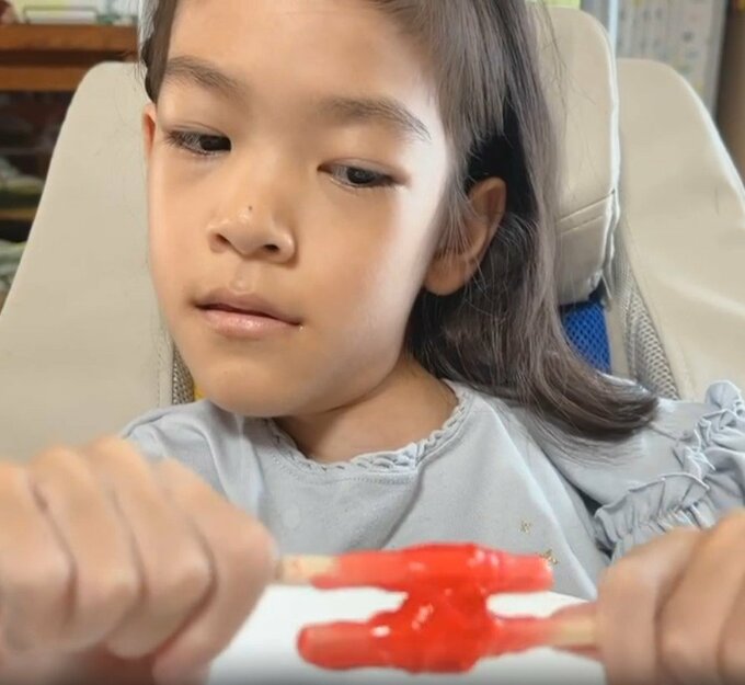 星野真里さんは「ばぁばの家にて、こねりあめをこねこねしています」と、ふうかさんが、赤い「水あめ」を練る動画をアップ。