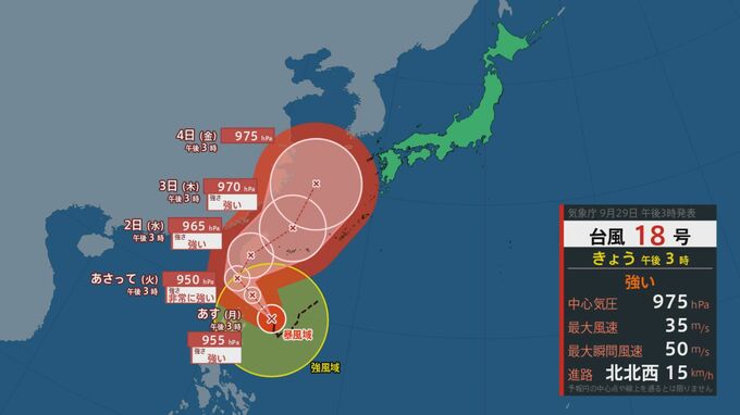 強い台風18号は、29日午後3時現在フィリピンの東にあって、1時間に15キロの速さで北北西へ進んでいます。中心気圧は975ヘクトパスカル、中心付近の最大風速は35メートルです。