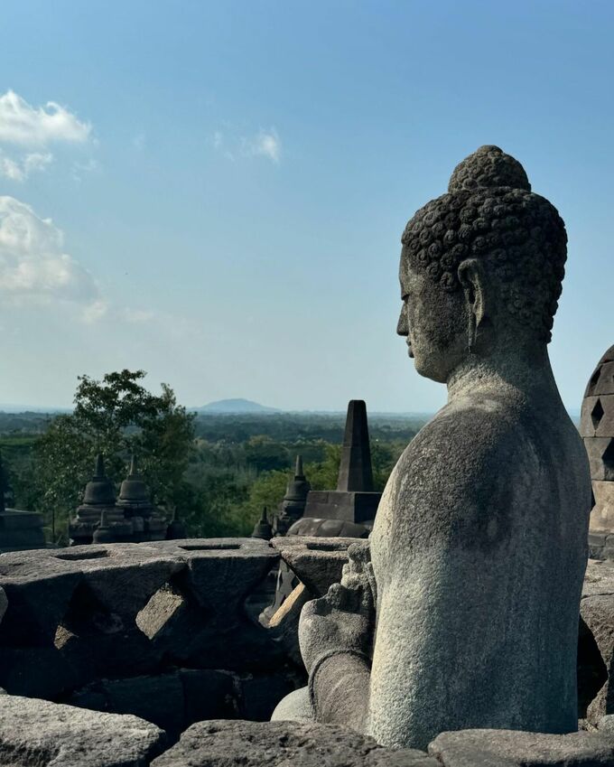 「一段ずつ登っていくことで、欲にまみれた人間の世界から、仏の悟りの世界へ続く道を体感することができる。つまり、寺院そのものが仏教の宇宙観を表した巨大な曼荼羅なのです」との解説とともに見晴らしの良い写真が投稿されています。